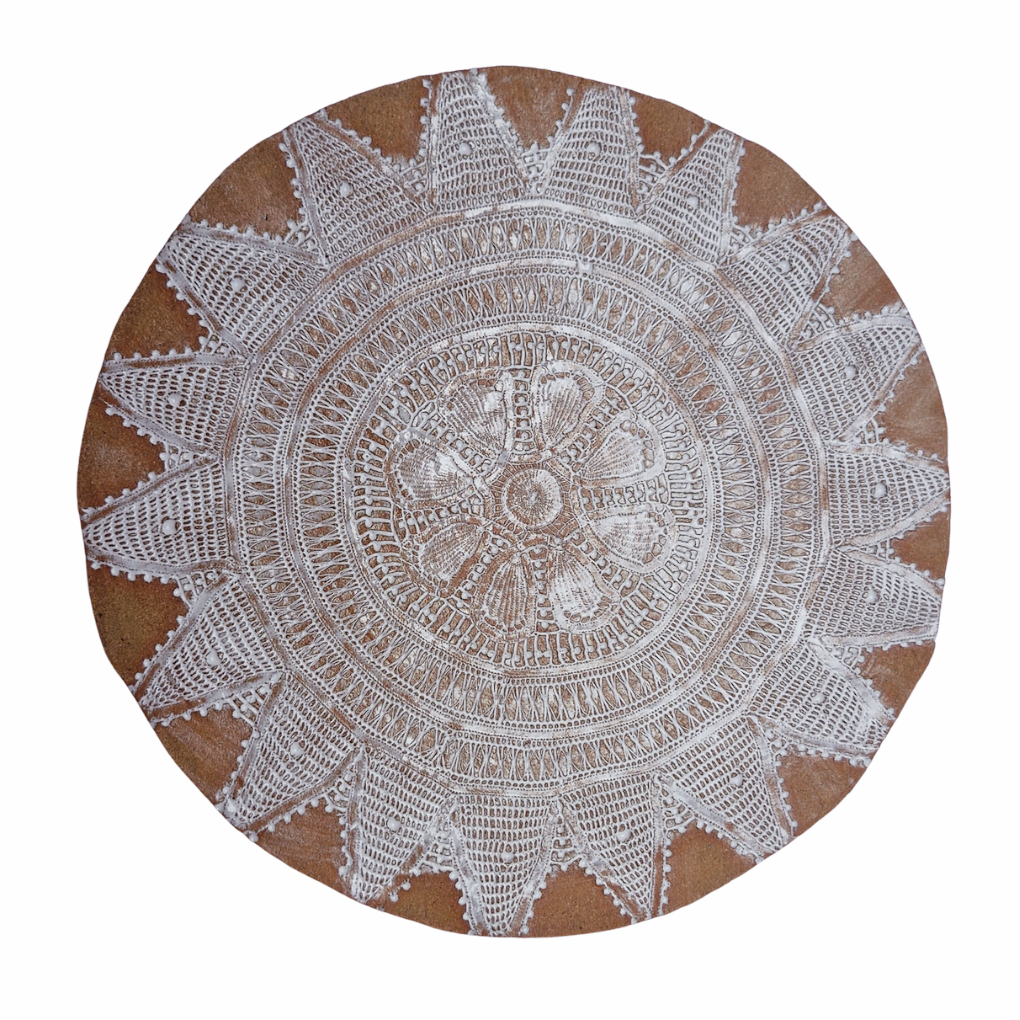 Modelado à mão, este sousplat carrega na superfície a memória da renda — impressa sobre a argila ainda úmida, revelando o encontro entre o gesto e o tempo. A textura delicada contrasta com a solidez da cerâmica, criando uma peça que é, ao mesmo tempo, funcional e poética.