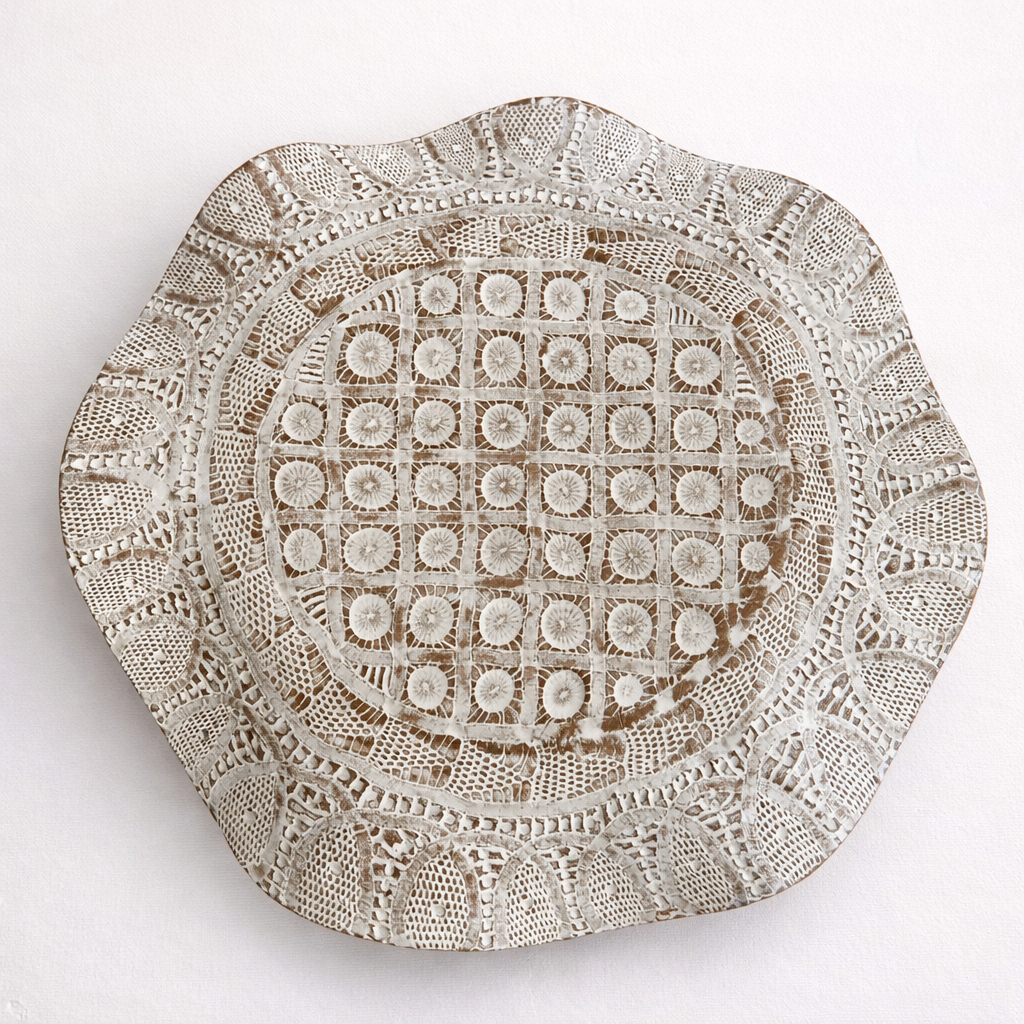 Boleira de cerâmica artesanal produzida manualmente, peça por peça. O detalhe em renda renascença é marcado na argila ainda úmida, criando uma textura delicada que valoriza a apresentação de bolos, tortas e sobremesas.